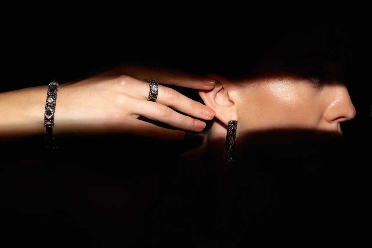 — Об этом могу говорить бесконечно! Проще, конечно, рассказывать о моде на примерах в нашем арт-бутике «ДАР». Как раз, формируя там экспозицию, мы постарались отразить все модные тенденции ювелирной моды. И «Лучшие коллекции сезона» по версии JUNWEX тоже можно увидеть там. Остановлюсь лишь на нескольких направлениях, чтобы помочь быстро сориентироваться в трендах. В 2026 году черный родий — это абсолютный хит. Если классическое серебро — это элегантность, то черный родий — это рок-н-ролл, драма и стиль «тихая роскошь» одновременно. Это современное гальваническое покрытие платиновой группы, которое делает украшение не просто тёмным, а придаёт ему глубокий графитовый или антрацитовый блеск. Во-первых, это практично: такое покрытие защищает серебро и не даёт ему тускнеть. Во-вторых, эстетика. Чёрный родий фантастически подчёркивает блеск камней. Они начинают «гореть» на тёмном фоне, как звёзды на ночном небе. Это металл с характером, который выглядит винтажно, дорого и необычно.