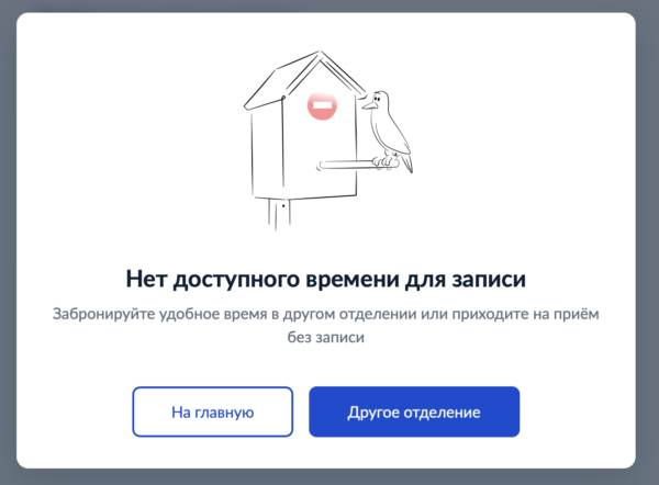 В первую очередь я зашла на Госуслуги — думаю, это же государственная услуга, значит на портале точно можно записаться, но увы и ах — не получилось. При попытке записаться всплывало окно, что отделения управления миграции перегружены по всем адресам в Костроме.
